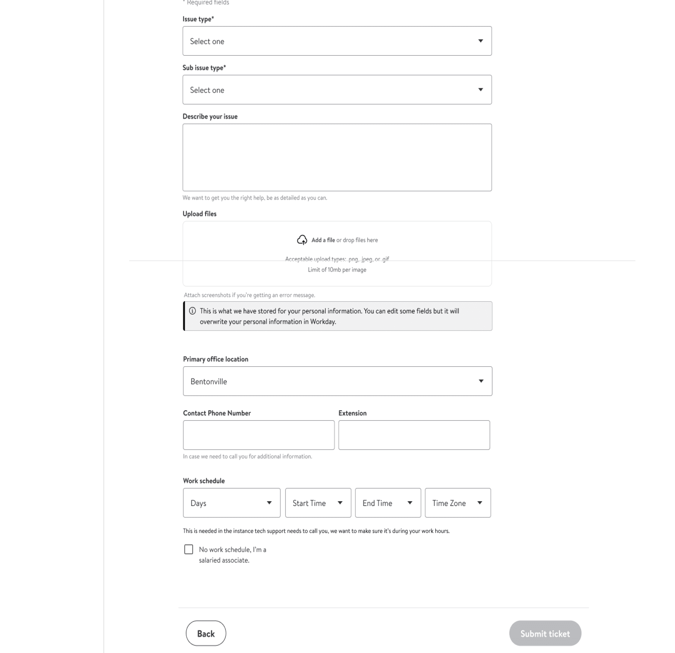 My first approach was a traditional ticket submission form. Associates would manually fill out all fields including personal information, and select from a dropdown of a minimal selection of issue topics. Simple to build, but frustrating to use.