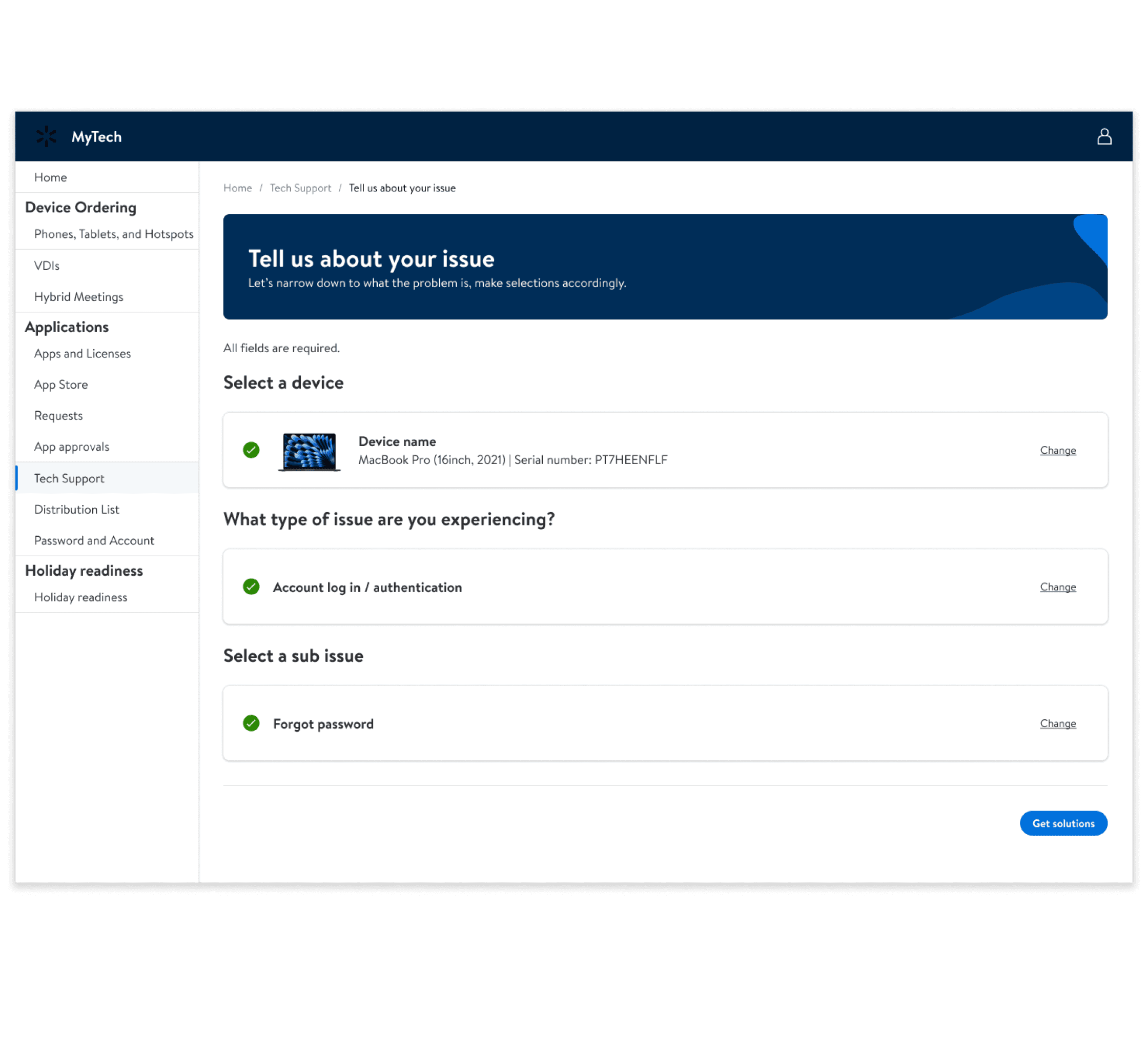 → Design Decision: Auto-populate device information by pulling from IT asset management systems. Associates see their assigned laptop, phone, and tablet models instantly.